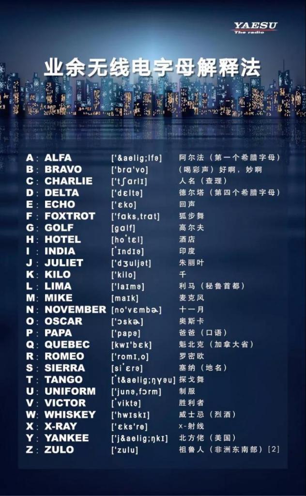 在语音通信中,双方的呼号、姓名、地址以及许多情况的说明都离不开英文字母在语音通信中,由于口音的不同,有些字母发音相近,再加上信号在传播过程中受到干扰、产生失真或因衰减等原因,使得对有些字母的听辨变得十分困难。为解决这一问题,人们约定用一些大家熟悉的单词来代表,解释相应的字母,这就是“字母解释法”。英语中的26个字母,分别可以使用26个单词来代表,以方便区分。我们国内称之为字母解释法。根据国际电信联盟(ITU)的规定,国际民航组织(ICAO)使用的解释法为“标准解释法”,业余无线电通信中也使用此一解释法。另外,也有用常用人名、地名、单词来代表、解释字母的,这种“非标准解释法”,有时也被使用。