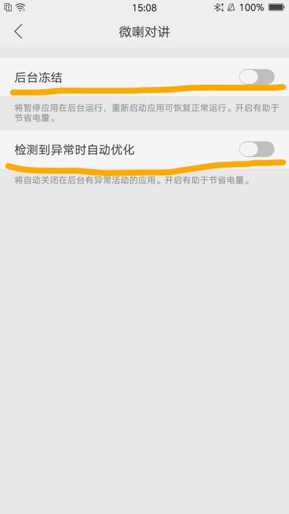 后台无法使用的(无法起麦,无法收到消息等)请先挂好后台,不管有没连接蓝牙,记得先挂好后台;挂后台是后台使用的基础;例如OPPO A57 设置 ->电池->耗电保护->微喇对讲 关闭后台冻结,自动优化;