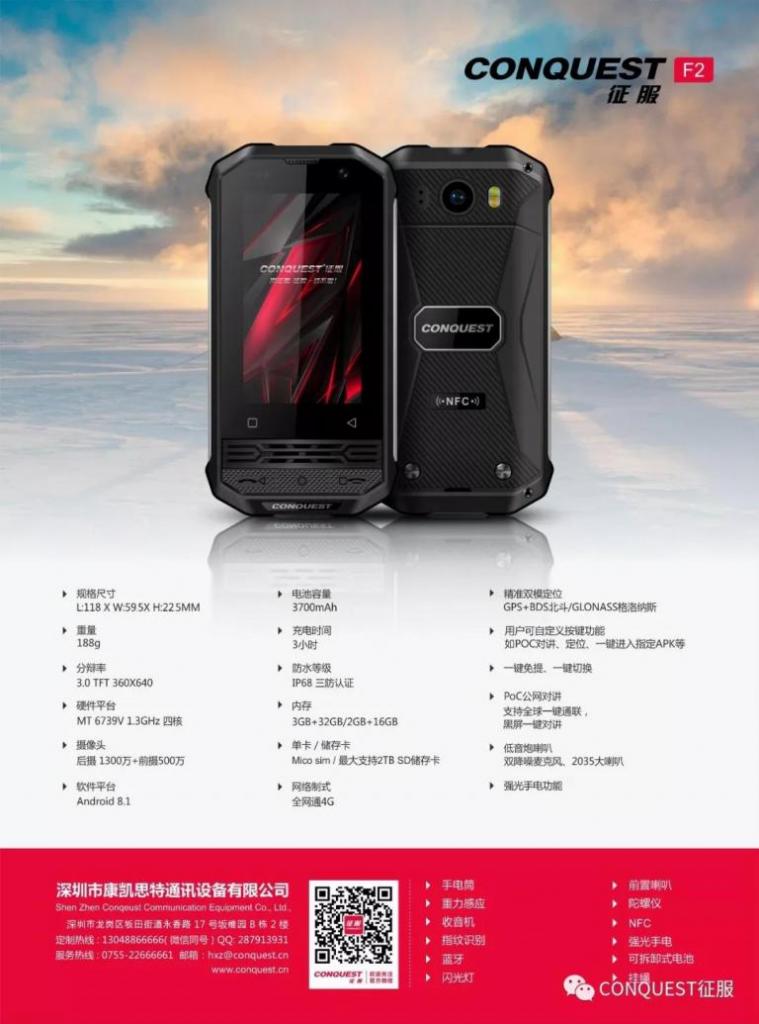 转发:小身材,大本领,户外三防对讲神器!征服CONQUEST F2迷你三防智能手机新品发布!娇小身材、强劲配置,让你惊叹不已!公司名称:深圳市康凯思特通讯设备有限公司公司品牌:CONQUEST征服(专业高端智能三防手持终端制造商)销售总监:杜秀秀手机:13534046331座机:0755-22666661QQ:1459868161微信:1459868161邮箱:dxx@conquest.cn行业定制:何小泽手机:13048866666微信:13048866666QQ :287913931邮箱:hxz@conquest.cn征服三防手机VIP交流QQ群:146169721微信公众号:CONQUEST征服三防手机官网:www.conquest.cn厂址:深圳市龙岗区坂田街道永香东路17号坂维园B栋2楼售后服务电话:0755-32970000售后服务微信:kk18923449465售后服务QQ:2188772915售后服务地址:深圳市龙岗区坂田街道永香东路17号坂维园B栋2楼售后服务部转发,原网址,小身材,大本领,户外三防对讲神器!征服CONQUEST F2迷你三防智能手机新品发布!娇小身材、强劲配置,让你惊叹不已!https://mp.weixin.qq.com/s/i1kn_gANVS47bwl9Ob5knw